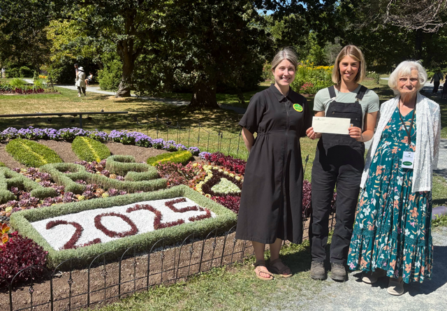 L- R: Andrea Bishop, Bursary Committee Chair; recipient, Annie Jivilian; and Judith Cabrita, President, Friends of the Public Gardens, in front of one of the two carpet beds designed by Annie.